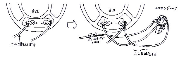 スピーカーの+側の線をはずし、延長線をつぎ足します。適当な長さの線をラジカセの「すきま」(どこかに必ずありますので探して下さい)から出し、イヤホンジャックにハンダ付けします。