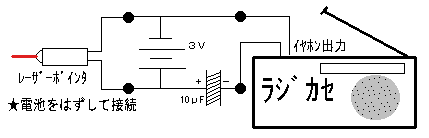 出力側は電池とレーザーポインターを下図のように接続します。