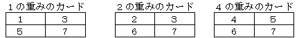 3枚のカードでは23=8通りの記号(0〜7の数値)を表現できる。 よって下記のように数値ではなく、記号と考えると