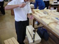 今回のベンチづくりは8時間で取り組ませましたが、実はその前に、左の写真のような技術室のイスを1人1脚づつ作ってもらいました。そこで学校の予算を使って取り組ませることで、道具や工作機械の扱いに慣れさせることもできます。多少手直しが必要なものも出てきますがこの手はけっこう使えそうです。