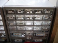 そして、この電動インパクトドライバが必需品です。単にコースレット(大きな木ねじ)をねじ込むドライバーとしてだけでなく、先端にキリをつければ下穴をあけることができますし、木工用のドリルに変えれば大きな穴も空けられます。作業台ごとに1台(合計8台)のインパクトドライバーを用意して使わせています。先端に取り付ける様々なバイトはこうして透明な引き出しに整理していつでも使えるようにしておきます。生徒達も最初は恐がりながらも、最後の頃にはバシバシ使っていました。そんなに力のない女の子でも十分に操作できていました。