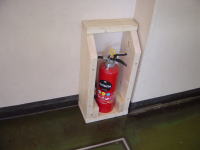 イスばかりでなく、学校で必要な様々な備品が2×4材でつくれます。右の写真は消化器が転倒して噴出してしまうという事件の後に試作した消化器プロテクターです。これから作ってもらうつもりです。給食の配膳台なんかもつくれるんじゃないかと今、思案中です。