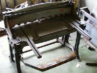 自分が作ろうとするモノの寸法を決めたら、鉄板にけがき線を引き、足踏みせん断機(写真)で必要な部品を切り出します。くれぐれもせん断機の刃には注意しましょう。
