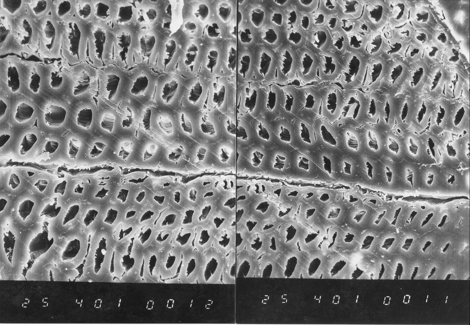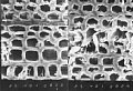 | 提示用の木材(スギ)の電子顕微鏡の連続写真です。例えば下の写真を全てA4サイズで印刷し、並べると黒板一杯になります。しかも全部合わせても1年間の成長分なのです。説明なしで写真を見ると、何だろうと思う。でもその写真が何なのか分かれば、生徒達からも驚きの声が上がるでしょう。 1,連続写真を通しての木材への思い 木が生きていることを一つの年輪を通して生徒にイメージさせたい。→環境教育 木材は、木の生命活動の証であり、一年間の生命活動が年輪となってあらわれている。人間(生徒)が毎年大きく成長するように、木も細胞分裂を繰り返している。 暖かくなると、葉を茂らせ花を咲かせるために大きな細胞に大量の栄養や水分を通わせ、寒くなってきたら、葉を落としたりして動物が冬眠するかのように活動を抑え、凍らないように細胞壁を厚くして暖かい日がくるのをじっとまっている。なんとすばらしいことだろう。 季節による成長の変化が年輪となってあらわれることはわかりきっているが、この写真のように、1年間の細胞分裂の様子をじっくりみてみると、その変化の大きさに驚かずにいられない。この写真を通して、生徒たちに「木も人も地球上に生きる仲間なんだ」 と感じてほしいものです。 |