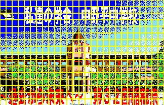 フルカラーの画像をドット画になるようにまず色を落とす減色処理を行います。有名なフリーソフト「ViX」で可能です。また2色にすると白黒画も作成可能。 そして文字を入れて原画が完成。 |