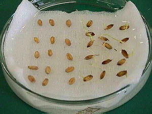 【やり方】 シャーレにガーゼ(ティッシュペーパーでもよい)をしいて、その上にコムギとイネの種子を並べます。種子が十分に水につかるほど水を入れ、日当たりのよい場所において観察をします。 3、4日もするとイネの方は発芽をはじめます(写真では右がイネ)。コムギの方はいつまでたっても発芽しません。ムギは水中では空気が少なくまったく芽を出さないことがわかります。それぞれの環境や育て方の違いがわかります。