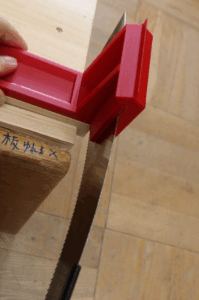 治具の底面とノコギリのこぎりの刃を合わせて、けがいた板の線の上に置くだけで、筋力ではなく、刃の切れ味で切っていけます。バランスにのみ注力すればよいです。
