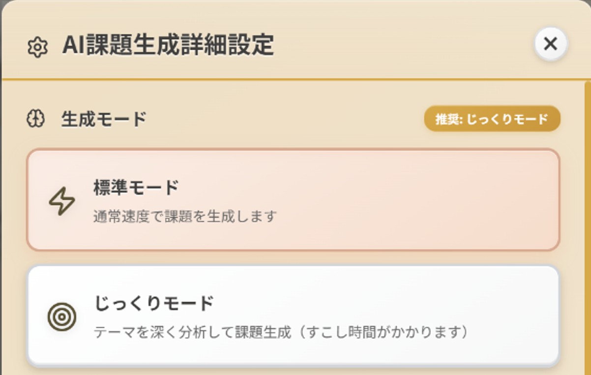 ・詳細設定をすることで、より具体的な課題や学習目的に細かく合わせた課題を生成可能。