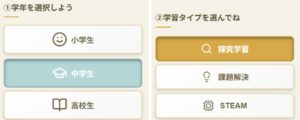 ・発達段階(小学生・中学生・高校生)や学習形態(課題探求・課題解決・STEAM)が設定でき、児童生徒の実情や学習に合わせた課題の生成が行える。