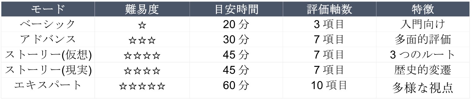 学習者のレベルや興味に合わせて、5つの異なるゲームモードが用意されています。