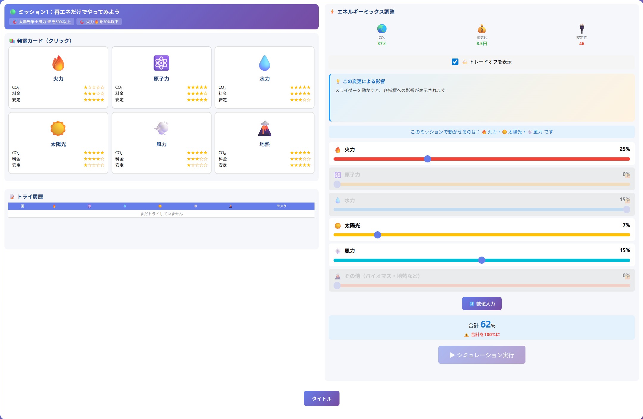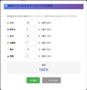 「日本エネルギーミックス大作戦」は、エネルギー政策の複雑なトレードオフを体験的に学べる教育用Web アプリケーションです。