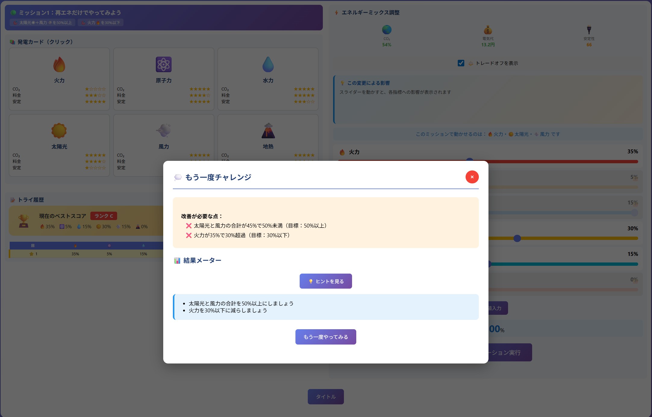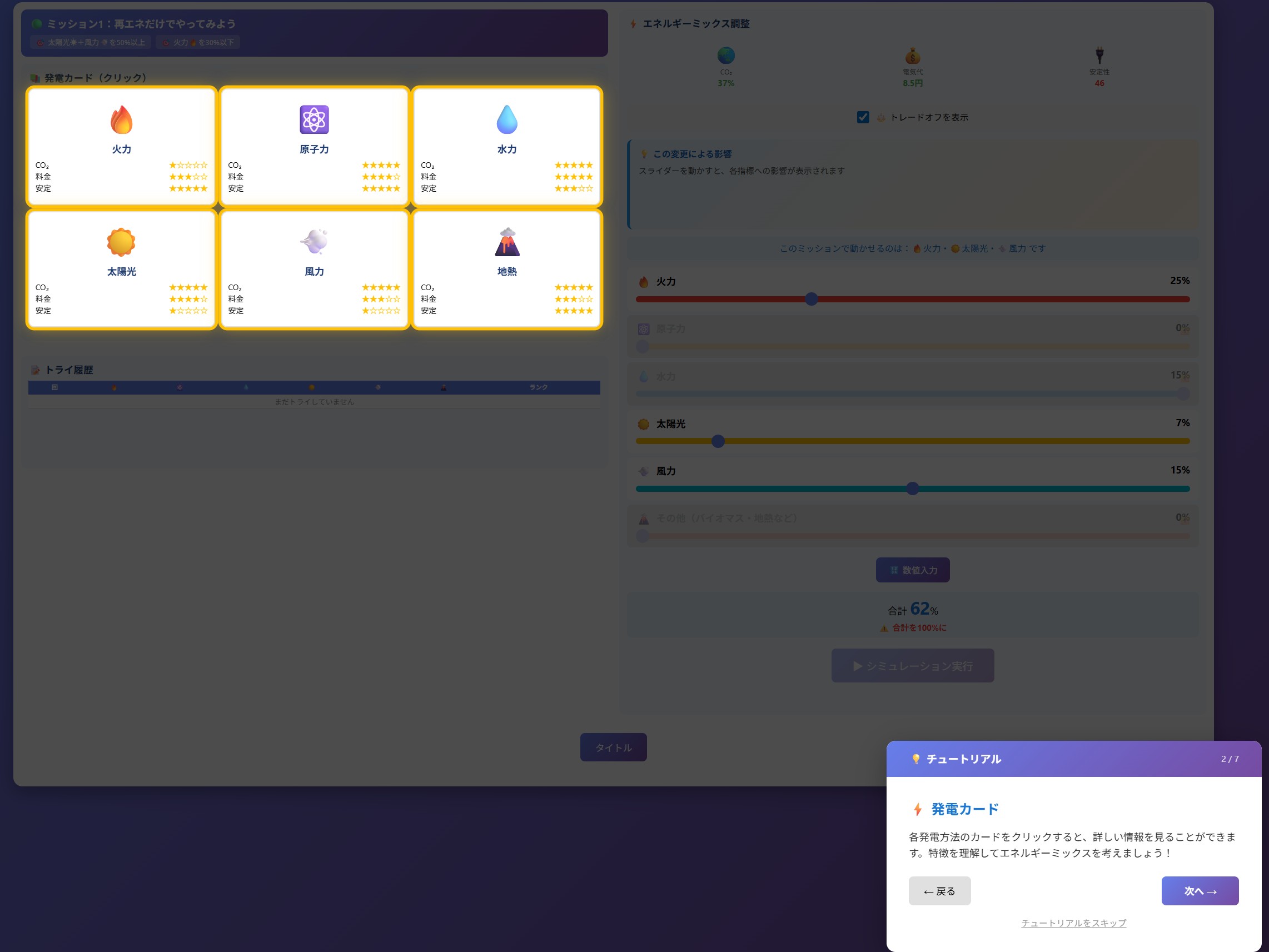 プレイヤーは日本のエネルギー大臣となり、6 種類の電源(火力・原子力・水力・太陽光・風力・地熱/バイオマス)の構成比率を調整しながら、CO2排出量・コスト・安定性などの相反する目標のバランスを取ることを学びます。