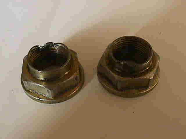 自動車の車軸(アクスル:axle)部分のナットです。機械要素としての「ねじ部品」で「ナット」の一例として標本に使えます。「アクスル・ナット」はタイヤの中心部分にある大きなナットで、ゆるみ止めのために「かしめ(コーキン:caulking)」が施されています。技術科での加工や機械の学習では「接合法」の一つとして「かしめ」の具体例として提示できます。