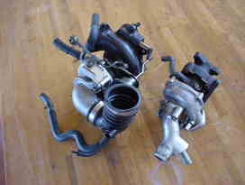 小さい方が排気量657(または658cc)のスズキ セルボ モードに搭載されているターボチャージャーで、大きな方が排気量1994ccのSUBARU BC5(スバル レガシィ RS系)のEJ20Gエンジンに搭載されているターボチャージャーです。どちらもIHI(石川島播磨重工業)製です。