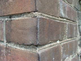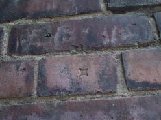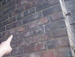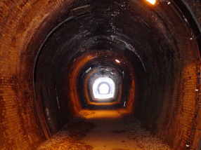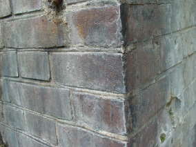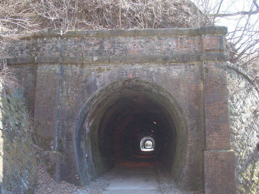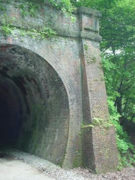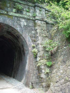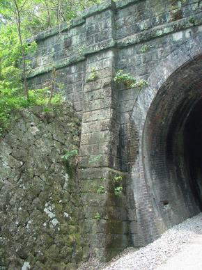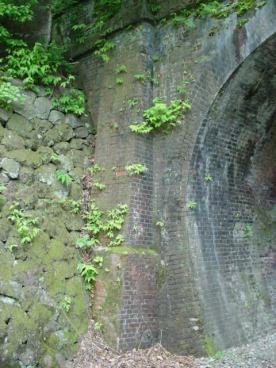「碓氷第4隧道」の出口(西口)付近 トンネル側壁の南側、起拱線(側壁とアーチの境界)部分にあります。 側壁部分は「イギリス積み」、アーチ部分は「長手積み」になっています。