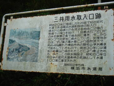 | 三井用水取入口跡 明治20年に完成したわが国で初の近代水道である横浜水道創設時の取入口。道志川と相模川の合流する地点に2個の突堤で小湾口を設け、1日最大5720m3の水を鉄管2条で抽水井に導き、そこからポンプで沈澄池に揚水していた。沈澄池からは、ずい道と導水管により自然流下で、約44km離れた横浜市内の野毛山浄水場まで送水していたもので、明治30年には道志川の青山に移されたことにより廃止された。また、この取水施設は、昭和60年5月 日本の近代水道発祥の史跡として水道100選に選定された。 昭和62年5月 横浜市水道局 |
