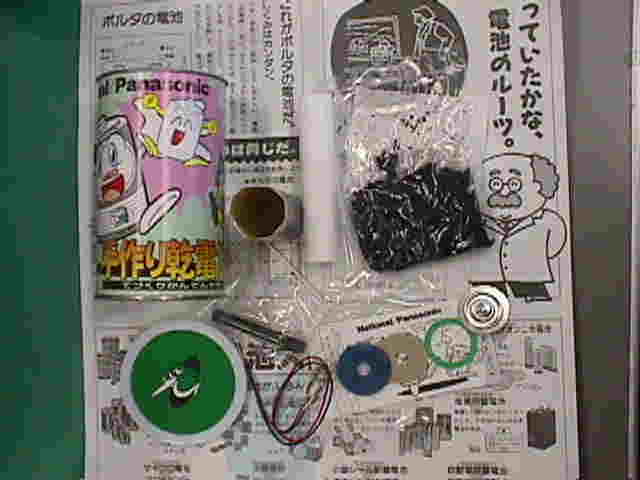 | 松下電器製の「手作り乾電池キット」!会場で「下さい!」と申し出たら一旦は断られましたが、しょんぼりしている姿を見かねてか、「じゃあ1つどうぞ・・・・」。担当者の方に感謝です(^^) このキットは電解液となる薬品(塩化アンモニウム)が二酸化マンガンに混ぜてある(合剤)ために、水を2cc加えるだけで済んでしまいます。熱収縮フィルム(チューブ)をつかってパックにするため、電解液が漏れる心配が少なくなっています。小学校低学年の子どもでも安全に乾電池づくりができるキットになっています。フィルムケースを使ったマンガン乾電池づくりを、技術科の学習ではやっていますが、こちらはマンガン乾電池のしくみや構造をしっかりわかってもらうために電解液を別に加える工程があったほうが良いでしょう。 説明書には、ボルタ電池や、現代の各種電池の解説があります。 |