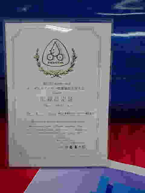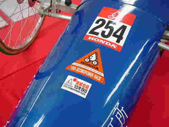 | 記録認定書、1リットルで426.223km走破。グループIII(高等学校の部)で167台中50位!エンジンチューニングやボディ設計ももちろんですが、意外とドライビングテクニックやノウハウが成績に影響してくるように感じられます。出場経験が蓄積されてくると「桐工恐るべし!」ですね。 | ボディ形状や車輪も空力特性を考慮されたものになっています。 | 車検合格証、大会ステッカー、参加車両番号がかっこいいですねえ〜 | |