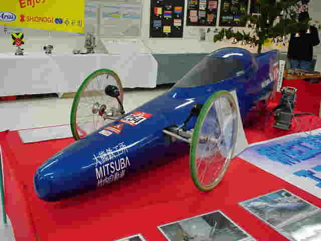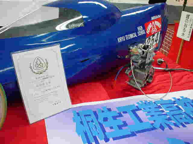 機械科の展示の1つに、毎年開催されている有名な省エネカーレース(1リットルのガソリンでどれだけ走行できるか)である「ホンダ宗一郎杯・ホンダエコノパワー燃費競技全国大会」への出場車両とエンジン(第19回大会出場車両のもの)がありました。