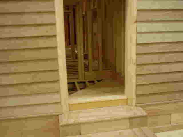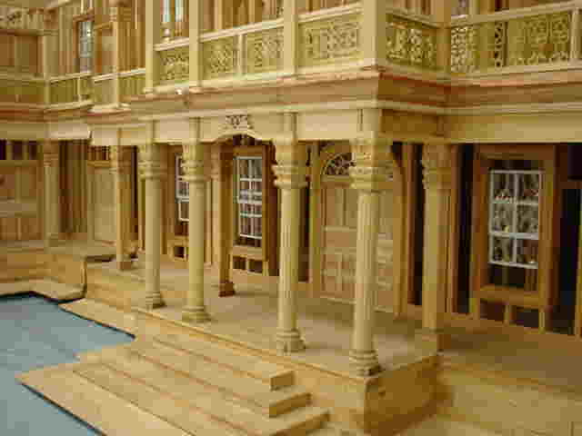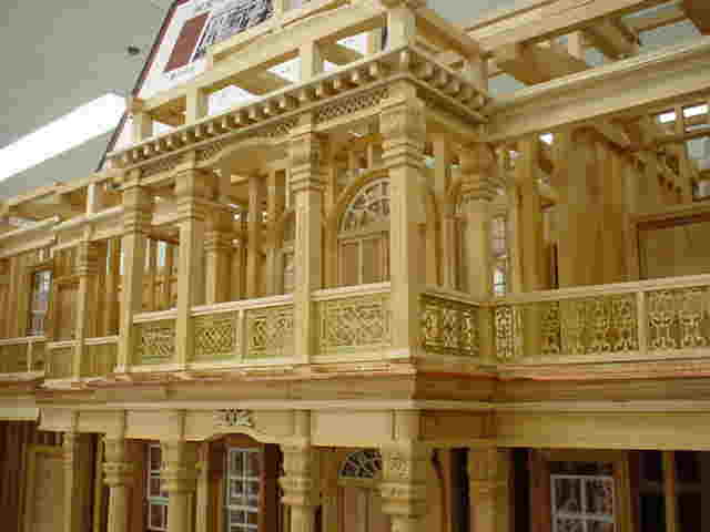 | 現在も製作中の模型です。縮尺1/10で、かなりの大きさです。 | 1995年から製作がはじまりました。 | 正面玄関部分 | 2階中央バルコニー部分 |