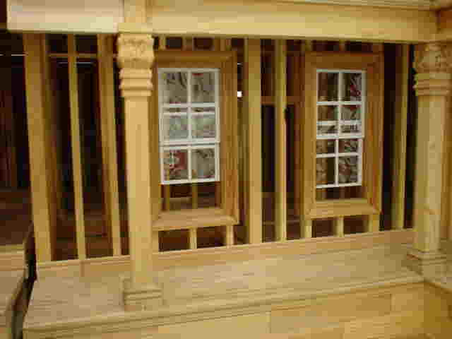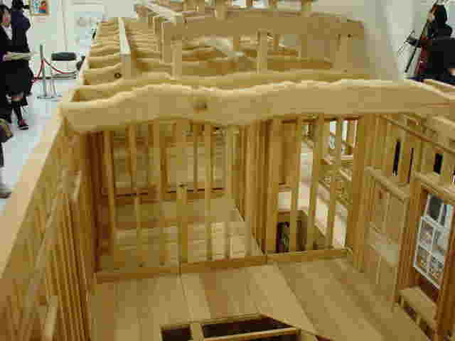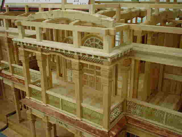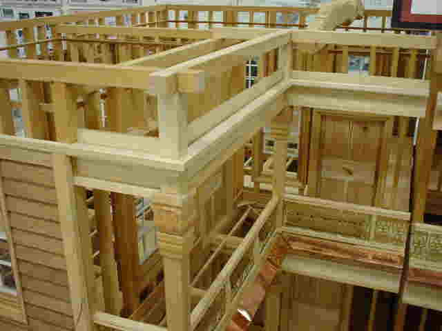 | 梁も形状がきちんと加工されています。小屋組が和風であるこの建物の特徴がよくわかります。 | 床の部分がカットモデル化されていて、建築構造がわかりやすくなっています。 | ブロンス格子や柱が丁寧に再現されています。 | 建築中の建物のようで、まるで中に入っていけそうなくらいリアル感があります。 |