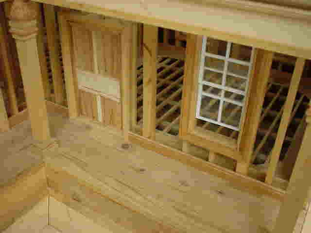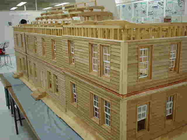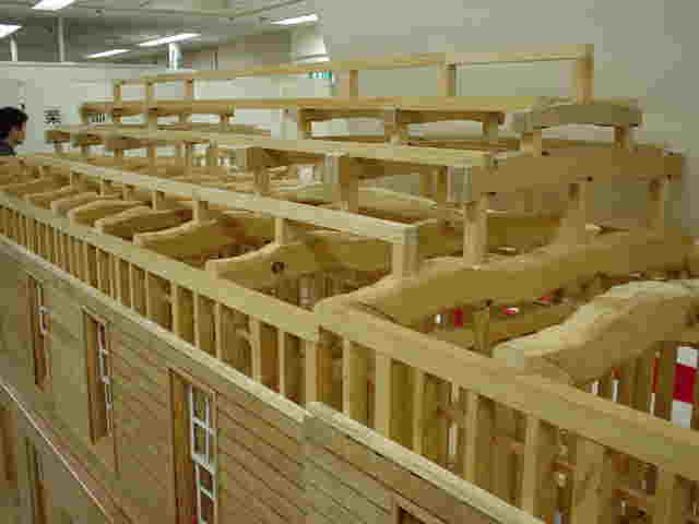| 目地漆喰塗の屋根が出来るのが楽しみですね。 | 2階バルコニーの奥に貴賓室扉が見えます。 | 丁寧な模型つくりがよくわかります。 | 屋根裏部分の構造がわかりやすい。 |