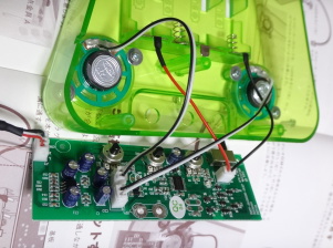 音の波の情報をもった+の電気でLED(発光ダイオード)を点灯させるしくみになっています。
