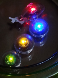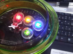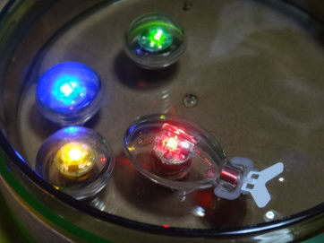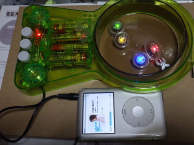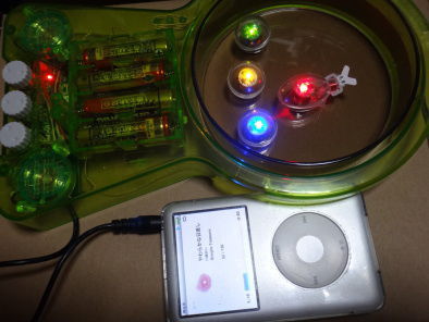 トレーに水を入れることができ、音楽を入力すると可動ユニット(LED赤)が尾びれを動かして泳ぎ始めます。