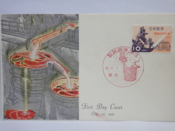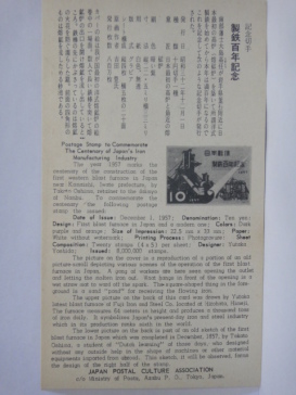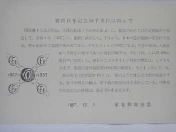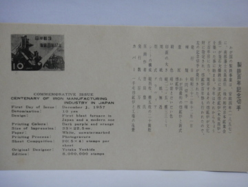 | 世界初の鋼製(steel foil)の切手で、アメリカ合衆国に発注して製作した切手です。 裏面はシールとなっていて、製造メーカーと材質・仕様が表示されています。「USS Steel Foil .001」 飯田賢一「鉄の語る日本の歴史 上」そしえて 1976年 で紹介されています。 |