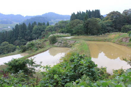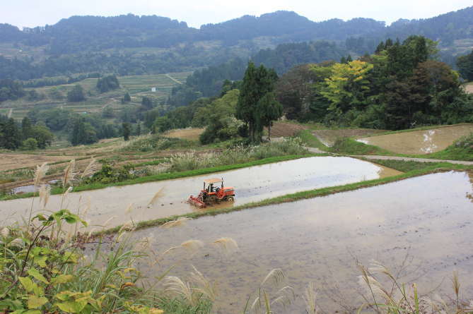| 新潟県の東頸城地域では、棚田での稲作に天水(雨水、雪)を利用するため、稲刈り後の秋に「代かき」を行います。 秋も冬も田んぼに水をためたままにしておく「天水田(てんすいでん)」です。 |