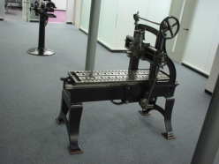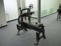 小型の平削盤(プレーナー)で、刃物が固定されていて、加工物を取り付けたテーブルが往復運動する基本的な構造がよくわかります。