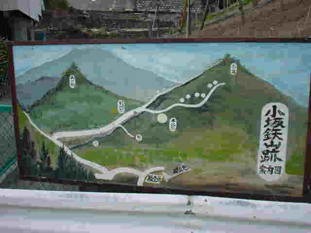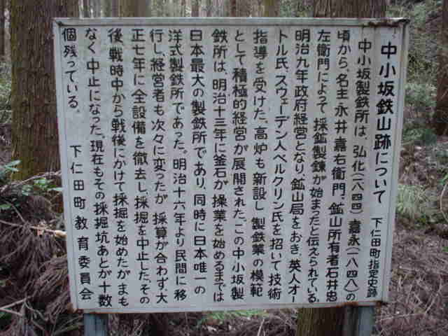 中小坂(なかおさか)での磁鉄鉱の採掘精錬は、幕末の弘化(1844)〜嘉永(1848)年間に、名主・永井嘉右衛門、鉱山所有者・石井忠左衛門によって始まったと伝えられています。小栗上野介も幕府直轄の大砲鋳造所を作ることを提案したときに、この中小坂鉄山に目をつけていました。