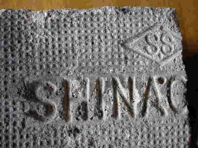 | 「品川白煉瓦会社」製 蝋石煉瓦(ろうせきれんが) 煉瓦表面の編目模様は、煉瓦を積み重ねる時にモルタルの付きを良くするためのものです。 |