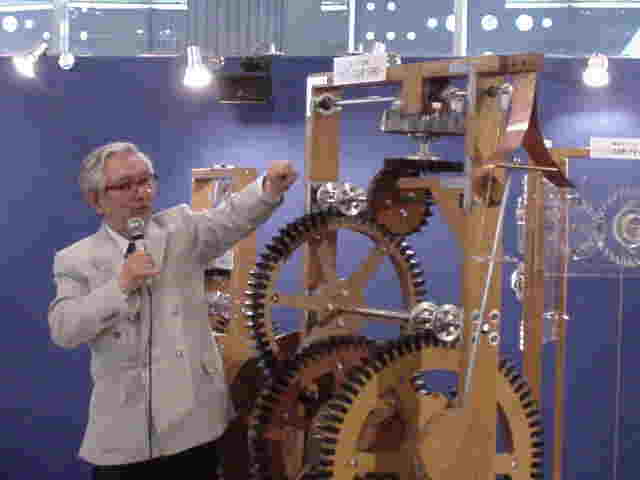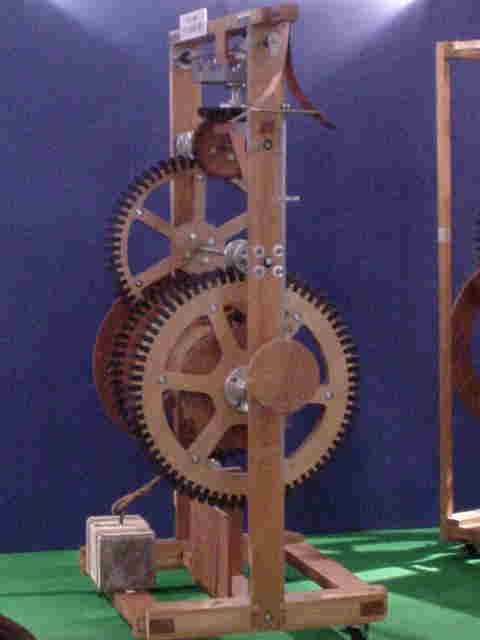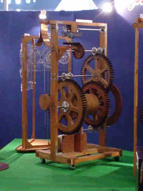 1658年にオランダのホイヘンスによって考案された初めての振り子時計です。振り子の等時性は1583年にイタリアのガリレオ・ガリレイによって発見されました。それまで機械時計に用いられていた「棒てんぷ」に代わって、振り子の運動で冠歯車の回転を一定にしています。振り子の長さを変えることによって時間の調整が可能です。振り子時計は機械時計の1日の誤差を10秒ほどにすることを可能にして機械時計がようやく実用的なものになりました。(棒てんぷ時計は1日で500〜1000秒の誤差があります。)