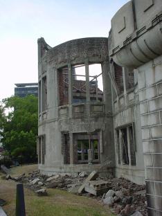 旧・広島県産業奨励館は、爆心地の北西約160mにあったため、建物の屋根や床はすべて破壊され、壁も1階の上端以上の大部分が倒壊しました。爆風がほぼ真上から建物に作用したため、建物の中心部は倒壊を免れました。