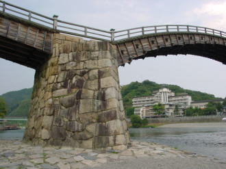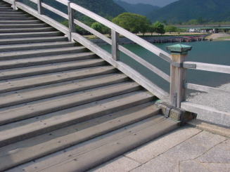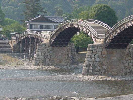 山口県岩国市の錦川に架かる5連の木造反り橋(中央3連がアーチ橋、両端が桁橋)で、日本三奇橋の一つです。