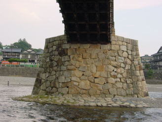 昭和25年の台風による大洪水で錦帯橋は橋脚部分を含めて流失してしまいました。その後の再建で木造橋部分は構造を復元し、橋脚については大洪水に耐えられるように基礎部分をケーソン基礎、橋脚本体はコンクリートにして、その表面を石積み化粧張りとし昭和28年1月に竣工しました。