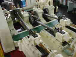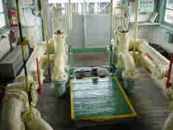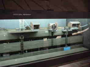 ここでは水門を開閉させる水圧シリンダーや水流ポンプ(実際に作動させてくれました)、蒸気式クレーン船「大金剛丸」(三池港に停泊して活躍する1905年以前のイギリス製浮クレーンで石炭を燃料に最大15トンを吊り上げることが可能)、三池式快速石炭船積機3号機(1911(明治44)年製の3号機が唯一現存しており積込能力は1時間300トンで設置当時は400トンありました。)などを見ることができました。