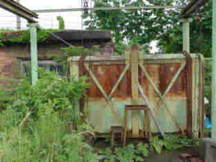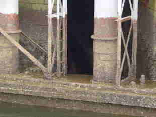 この扉の遮水を確実にするため、接着面には木材を用いていますが、その材料は船虫など虫害に強く、比重の思い南米産グリーンハートという特別な材を用いました。この用材の予備を渠内の水中に保管して置きましたが、昭和56年に引き上げてみたところ、76年も経過していたにもかかわらず十分に使用に耐え得る状態でした。また、大型船が渠内に入港したときに海水を逃がす「スルースゲート」が閘門式水門の両側に設置されています。