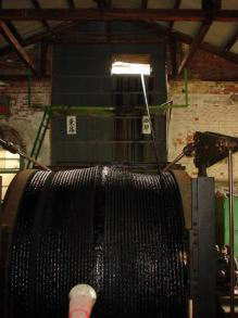 捲揚施設・・・捲揚機室、捲揚機(原動機、捲胴)、鋼索(ワイヤーロープ)、櫓、ケージ(鉄製の箱)など