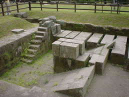 ここからは炉床の下部構造を見ることができます。規則的に並んだすのこ状の石の配列は通気用の炉下空間(空気層)で、炉内に湿気がたまることを防ぎ、炉の温度を適正に上昇させるために設けられていました。傾斜させた石組は灰穴の灰落としで、この上に火床(ロストル)があり燃料(石炭または木炭)を燃やしました。また、ここから風を入れ、風は炉内を通って炎を導き、煙突に抜けていきました。
