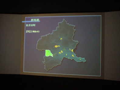 | 私の町に電気がやってきた・・・ オリエンテーションホールの大型3面プロジェクターで調べてみると・・・・ 群馬県碓氷郡松井田町に電灯がやってきたのは 1911(明治44)年! 群馬県内でも非常に早い時期だということがわかります。 (オレンジ色の部分がそれまでに電灯線が引かれていた地域です。) |