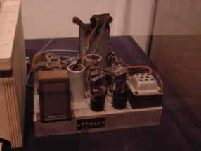 木原信敏氏が製作した磁気テープの録音再生実験機の再現です。輪状にしたテープを蓄音機のターンテーブルで駆動させました。ヘッドはワイヤーレコーダーのものを参考に自作し、アンプには真空管ラジオの増幅回路を改造したものを使用しました。(株式会社ソニー木原研究所/製作・所蔵)