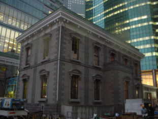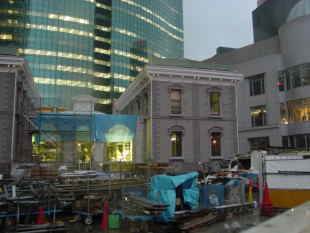 現在、旧・新橋停車場駅舎が復元工事中(2003年春に竣工予定)です。この復元工事は、残っていた駅舎の基礎部分(国の重要文化財)や、竣工当時の写真をもとに行われており、プラットホーム(25m)も復元され、資料展示室も設置される予定です。また、発掘されて現存する当時の駅舎へ入るための階段の一部も見ることができるように復元されます。旧・新橋-横浜間鉄道創設起点跡が鉄道記念物や史跡に指定されています。復元される駅舎の建物は、当時の石造建築の姿にできるだけ近づけるため、石材も4年間にわたって調査されて選ばれた3種類の石材を、それぞれ福島、札幌、神奈川から取り寄せて使われています。2003年4月10日に一般公開の予定です。