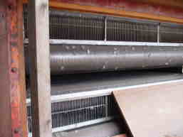 多段バンド型移動式繭乾燥機は上室(高温区)、中室(中温区)、下室(低温区)から構成されていて、上室に入った生繭が中室、下室と移動しながら熱風で乾燥させられていきます。各室に加熱器・送風機・排風機があり、熱風の温度・湿度・風速が制御できるようになっています。
