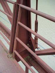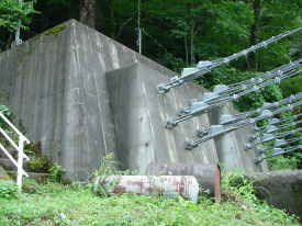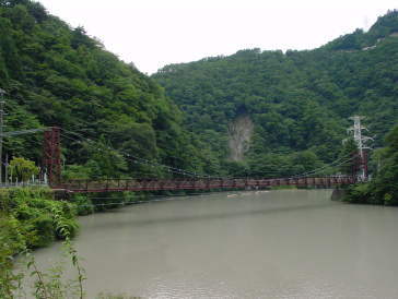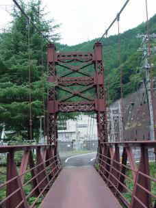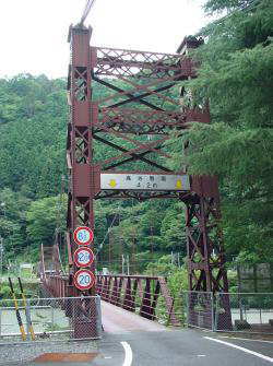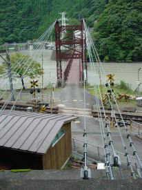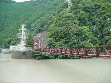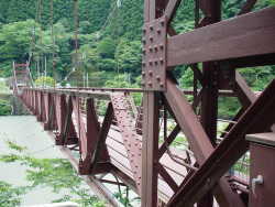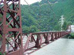 | 「市代吊橋」は、昭和11年大井川電力(株)大井川ダムの建設に伴い、木材の流送を補償するため、 鉄道用吊橋として建設された。 昭和29年鉄道を井川まで延長する際ルートが変更となり、市代吊橋は道路橋となった。それ以前、 昭和8年寸又峡に飛龍橋・昭和10年土本に三叉橋が鉄道用吊橋として建設されたが、これらは戦後 永久橋に改築されたため、残っているのは市代吊橋だけである。 若干の改造は行われているが、鉄道用吊橋の構造をよく残し、橋梁の歴史を語る貴重な吊橋である。 認定者 産業考古学会 認定年月日 平成12年5月20日 吊橋仕様 製造者 三菱重工業(株) 製造年 昭和11年 型式 サスペンショントラス 径間 106.74m 幅員 2.12m 制限重量 8トン |