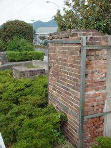 ここにある門柱状の煉瓦積遺構は桐生産の煉瓦で、水路を潜り、発電所と工場をつなぐトンネルの支えとして造られたものです。桐生総合厚生病院の改築工事中に、発電所跡のすぐ脇で煉瓦積の遺構が発見され、1988(昭和63)年に発掘調査が実施されました。この並立した門柱状の煉瓦積は、発電所に関係する日本織物株式会社創立当初の遺構で、使用されている煉瓦は、工場建設のために桐生煉瓦製造会社において製造されたものです。
