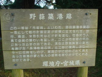 | 野蒜築港跡 この一帯は「市街地」といわれ、野蒜築港事業の 一環として都市計画街路が縦横に区画された、銀 行、商店、米取引所などが軒を連ね、往き交う人 馬で空前の賑わいを呈した。ここが市街地の中心 にあった公園の跡である。現在は野蒜築港に身命 を捧げた「黒澤敬徳の碑」と工事に使用したロー ラーに往時をしのび、激浪の中に幻のごとく消え 去った築港の夢と先人の苦闘を語りかけてくれる だけである。 環境庁・宮城県 |