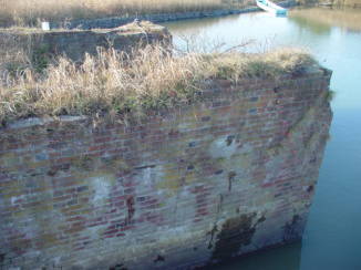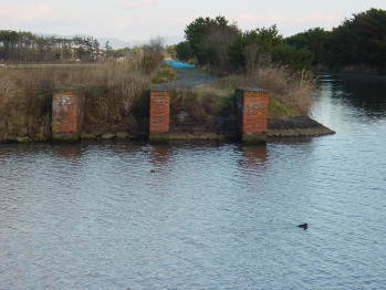 内港に鳴瀬川からの土砂が堆積するのを防ぐため、1879(明治12)年11月に新鳴瀬川の開削工事を着工し、鳴瀬川、新鳴瀬川、北上運河に囲まれた湿地は埋め立てられて市街地(現在の鳴瀬町浜市桶場)として造成されました。新鳴瀬川には3ヶ所に橋が架けられました。現在、煉瓦造の橋台が残っており往時をしのばせています。