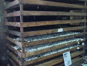 製糸工場が購入した原料繭は、繰糸までの間に貯蔵しておく必要があります。器械製糸が始まった頃は、原料繭は、住居の2階や穀物などを保存しておくために建てられた土蔵などに貯蔵しておきましたが、穀物用の土蔵は換気が不十分で、原料繭の貯蔵期間中に繭にカビが発生することがありました。